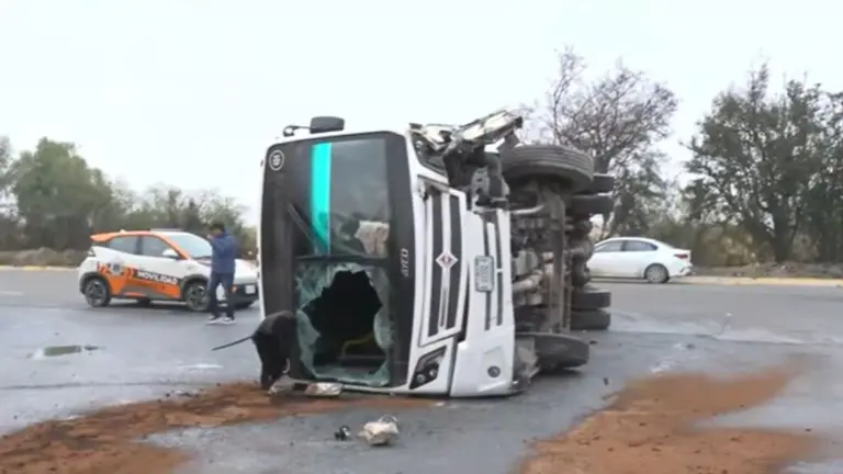 Estas condiciones habrían provocado que el conductor perdiera el control. El camión terminó volcado sobre la carpeta asfáltica, bloqueando parcialmente la vialidad.